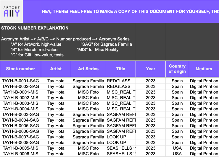 The Artist Ally Inventory is a Google Sheets template designed to help artists, curators, and small galleries bring clarity, continuity, and calm into how they manage artworks, prints, and merch — without turning their practice into bureaucracy.